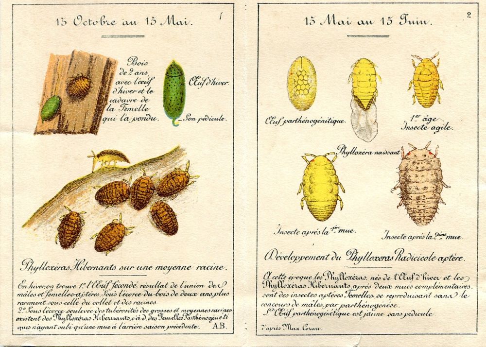 Revenons sur l’histoire de cette pandémie… C’est en 1863 que les premiers plants phylloxérés sont repérés dans le Gard. Mais il faut attendre 1868, pour que trois scientifiques de la Société d’agriculture de l’Hérault parviennent à identifier l’origine de cet étrange dépérissement. Le responsable ? Un minuscule puceron qui s’attaque aux racines et suce la sève. La vigne se dessèche et meurt en trois ans. En été, l’insecte connaît une forme ailée qui accélère sa propagation. Et comme un seul insecte, en une année, a une descendance de 10 millions d’individus, il est presque invincible. Il faut noter aussi sa résistance au froid, survivant à l’hiver de 1879 où la température tombe à -28°C.