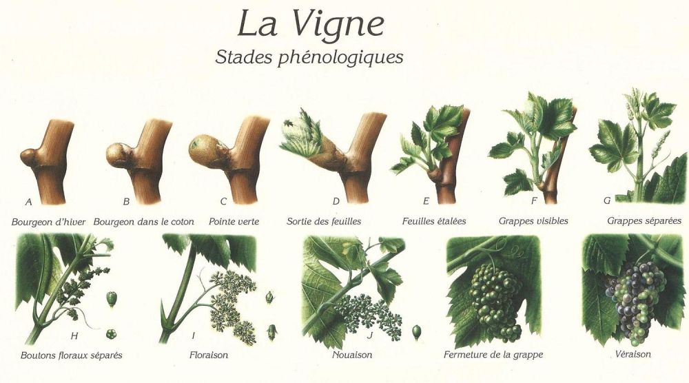 Concernant la vigne, on dénombre 7 grands stades phénologiques, eux-mêmes divisés en plusieurs stades : débourrement, développement des feuilles, apparition des inflorescences, floraison, développement des fruits, maturité et coloration des baies puis mise en dormance automnale. Cela débute donc avec les bourgeons d’hiver et se termine à la chute des feuilles à l’automne suivant avant de commencer un nouveau cycle (vous pouvez en savoir plus ici)