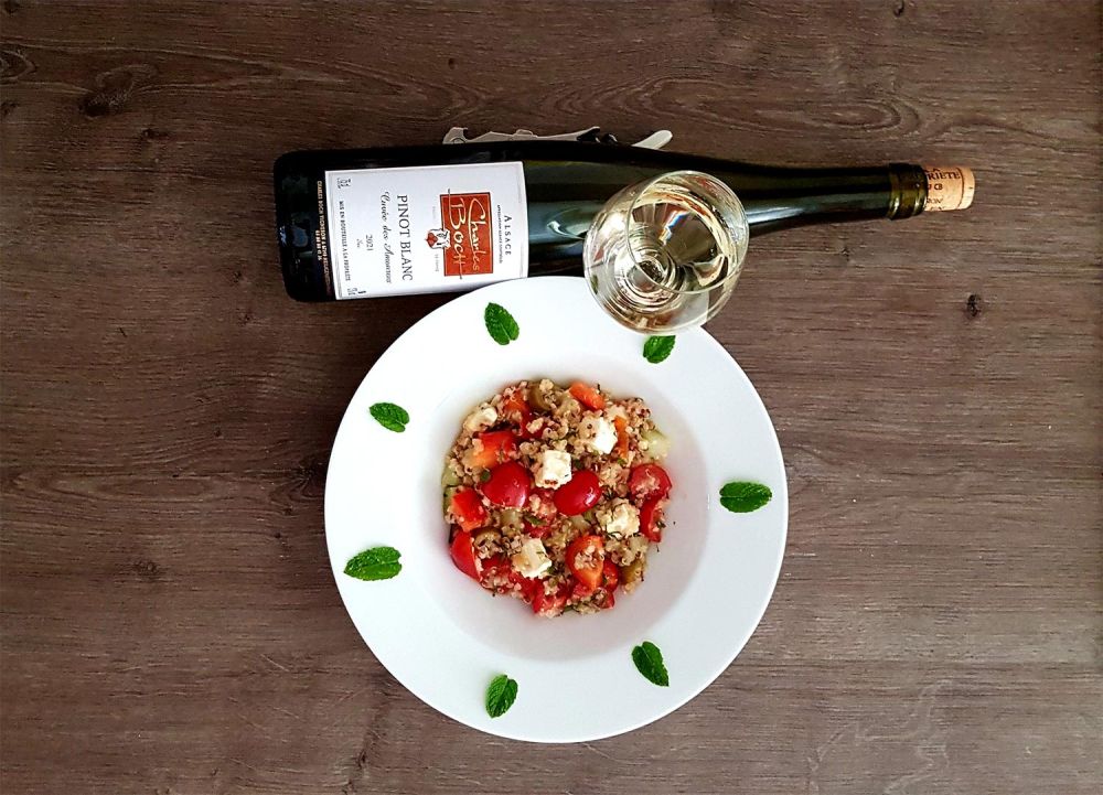 Salade de quinoa à la grecque accompagnée de notre Pinot Blanc Cuvée des Amoureux 2021