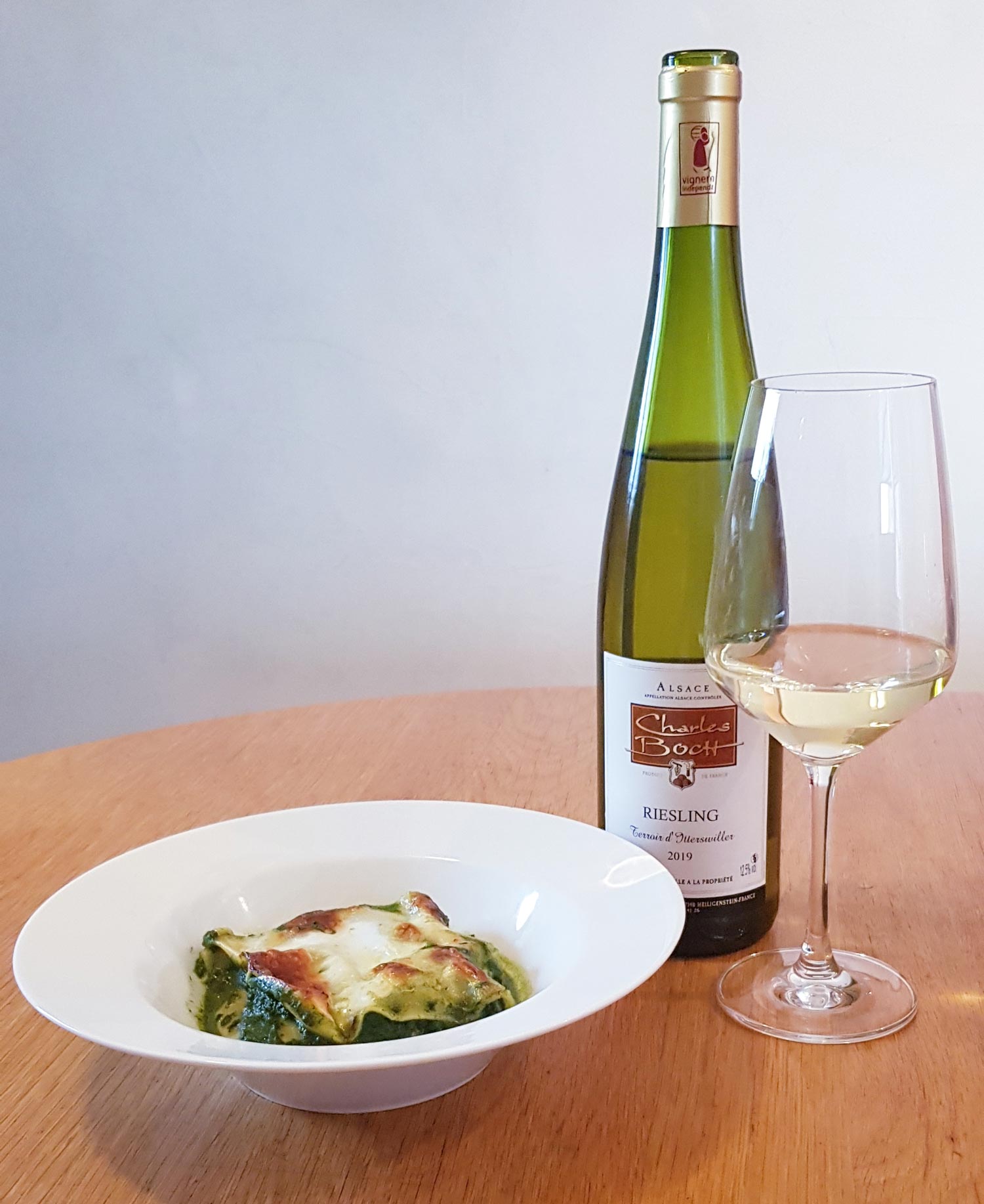 Lasagnes au saumon et épinards accompagné de notre Riesling 2019 Terroir d’Itterswiller